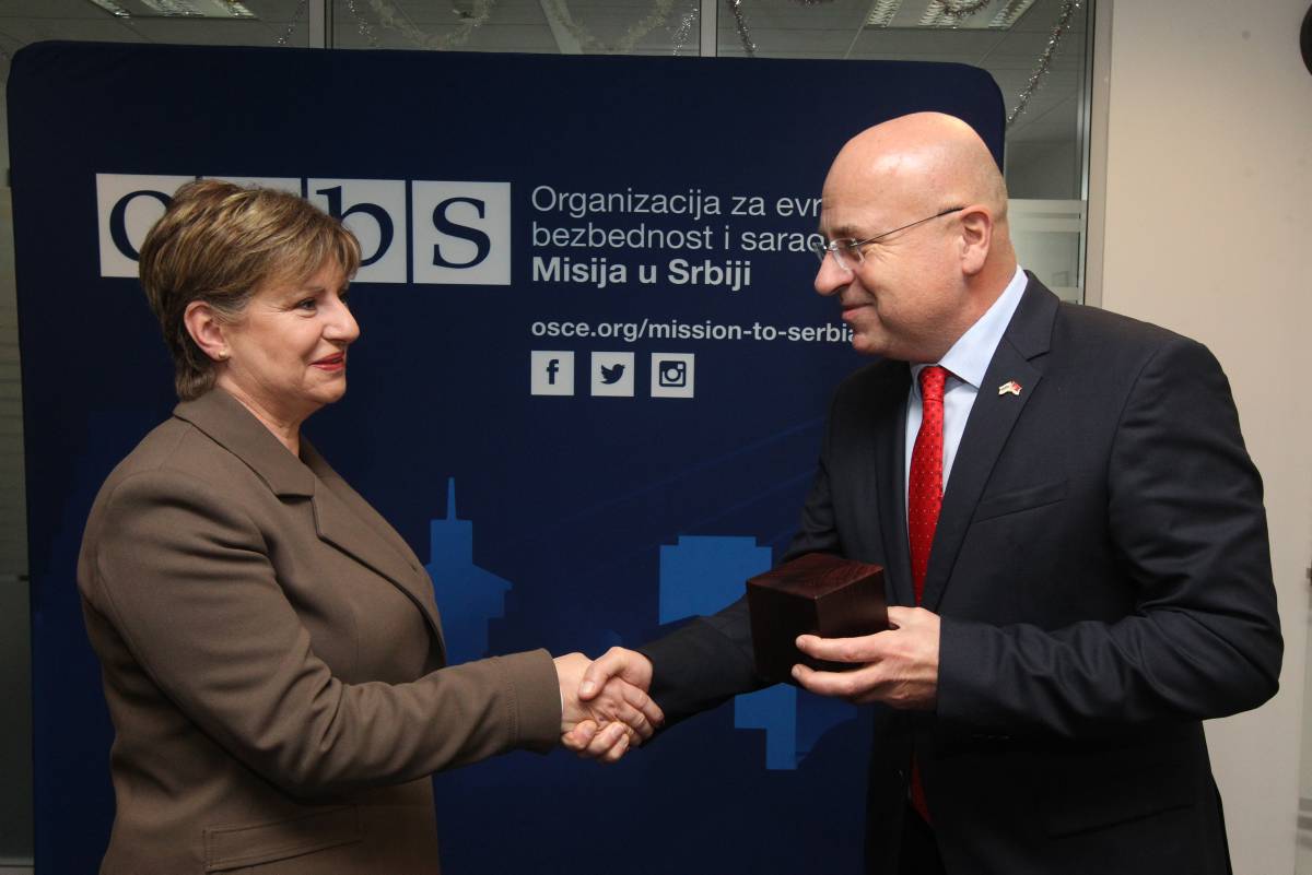 The Head of the OSCE Mission to Serbia presents the 2025 Person of the Year award to Amela Bajrović, Editor-in-Chief of the Free Media portal from Novi Pazar, Belgrade, 17 December 2025
