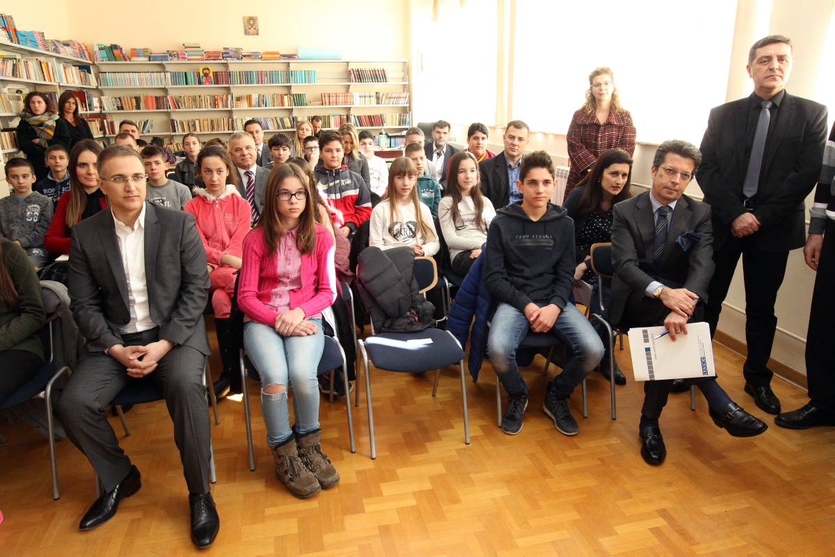 Ambassador Orizio, Minister Stefanović and students of the Pavle Popović Primary School listen to a safety presentation on drug and alcohol abuse, Belgrade, 12 February 2018.