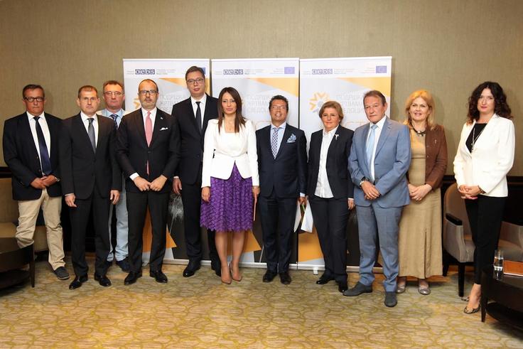 Serbian President Aleksandar Vucic poses for a family photo with representatives of the OSCE Mission to Serbia, the EU Delegation to Serbia and senior Serbian officials at the official launch of the Support for Victims and Witnesses of Crime in Serbia project, Belgrade, 1 June 2018.