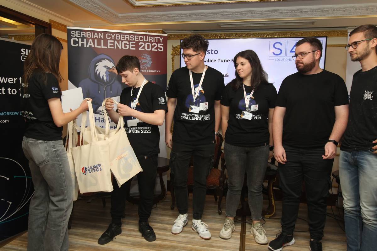A group of contestants of the 2025 Serbia's National Cybersecurit Challenge competition, supported by the OSCE Mission to Serbia, receive their awards at an award ceremony, Belgrade, 14 May 2025