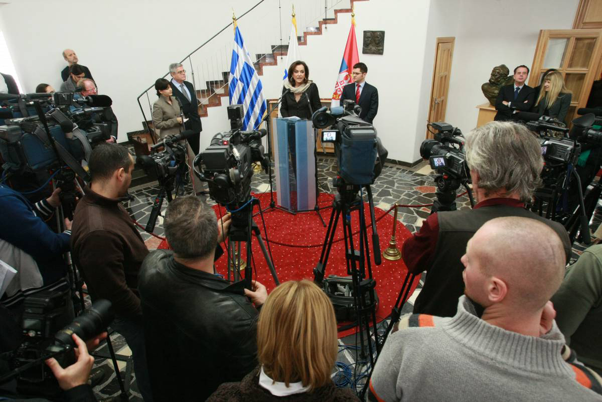 OSCE Chairperson-in-Office, Greek Foreign Minister Dora Bakoyannis and Serbian Foreign Minister Vuk Jeremic speak to journalists in Belgrade, 2 February 2009.