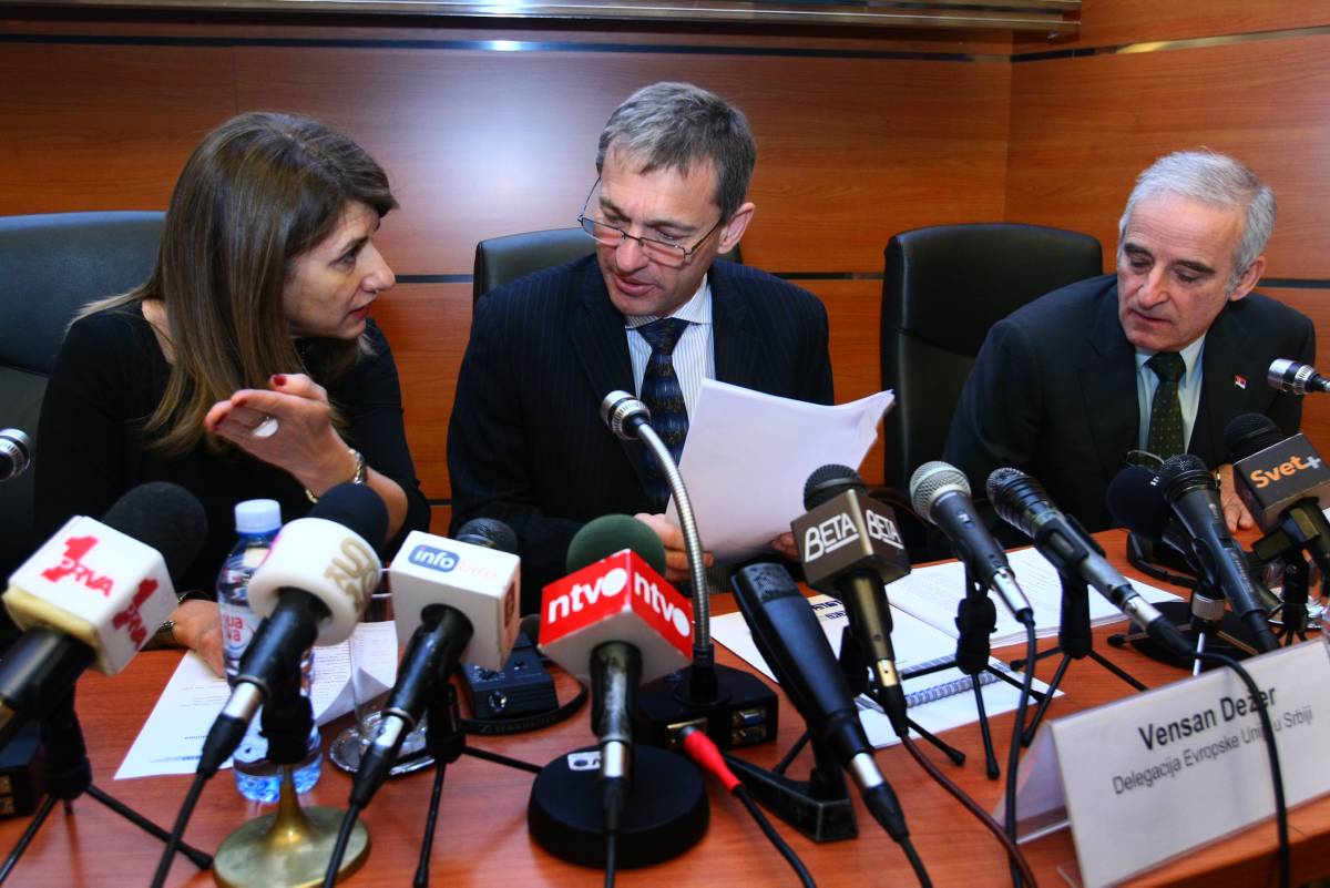 Many broadcasters found time to not only actively participate in the discussions but to simultaneously cover them for their own media. On the panel during the public debate in Belgrade, Dragana Nikolić Solomon (l), Head of the Mission’s Media Department; Vincent Degert (c), Head of the EU Delegation in Serbia; and Bratislav Petković, Serbia’s Minister of Culture and Media, Belgrade, 19 March 2013.