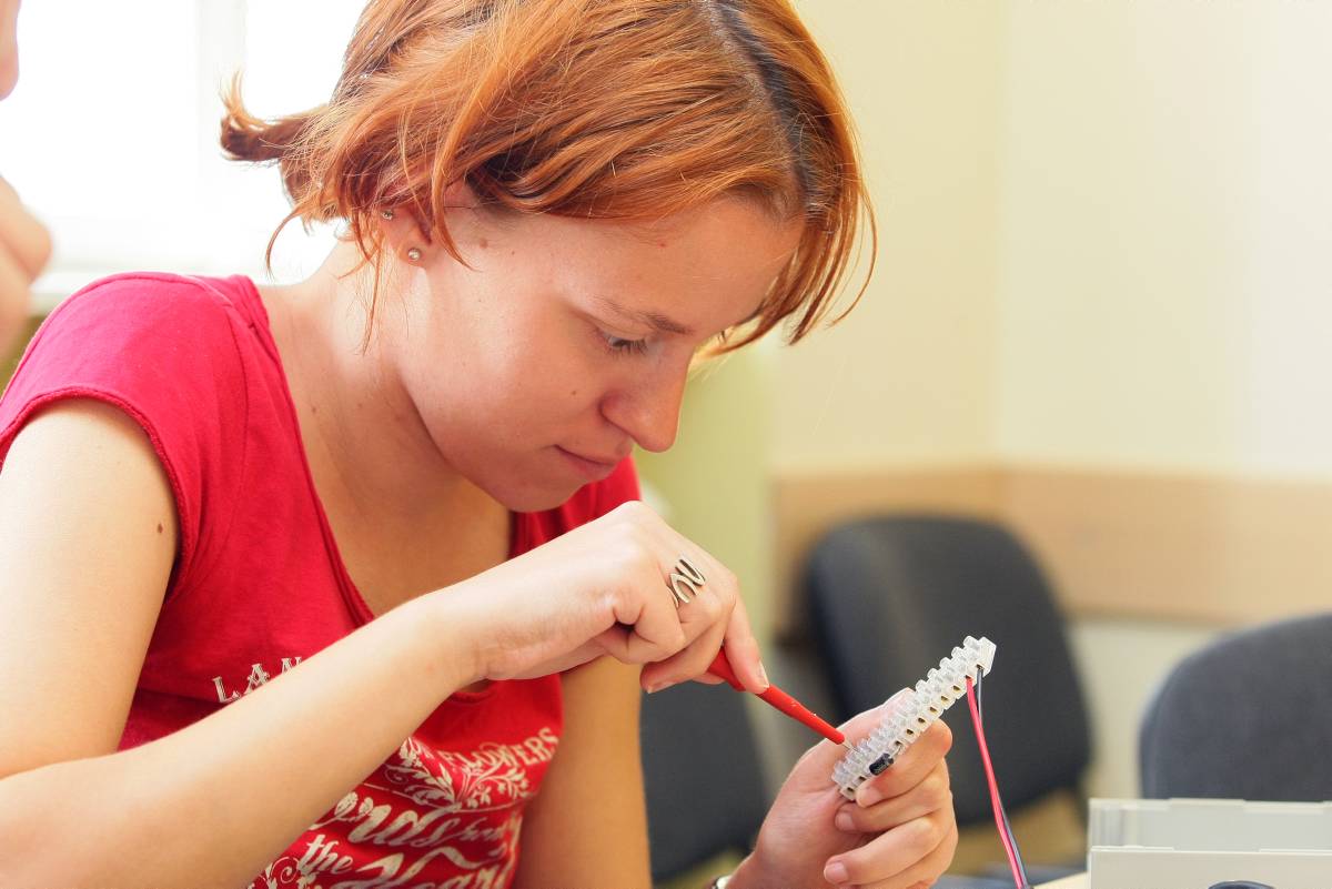 A high school student from Novi Pazar puts together the components of a solar panel during an educational camp on environmental issues, Sremski Karlovci, Serbia, 28 June 2013.