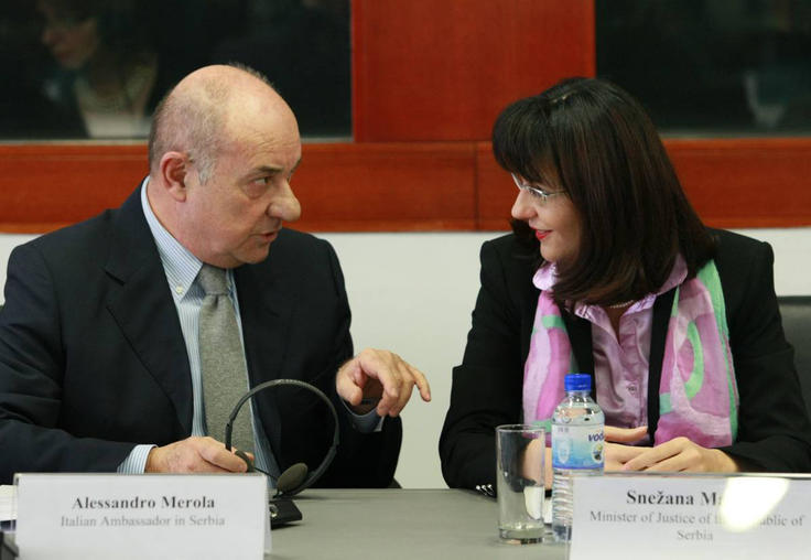 Italian Ambassador in Belgrade Alessandro Merola (left), talks with Serbian Justice Minister Snezana Malovic at the opening of a workshop on the legal framework for undercover investigations, Belgrade, 12 March 2009.