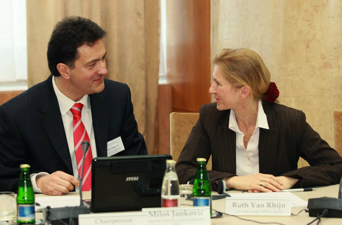 Deputy Ombudsperson Milos Jankovic (left), speaks to the Deputy Head of the Mission to Serbia, Ruth Van Rhijn at an OSCE-organized conference on preventing torture in Serbia, Belgrade, 23 March 2009.