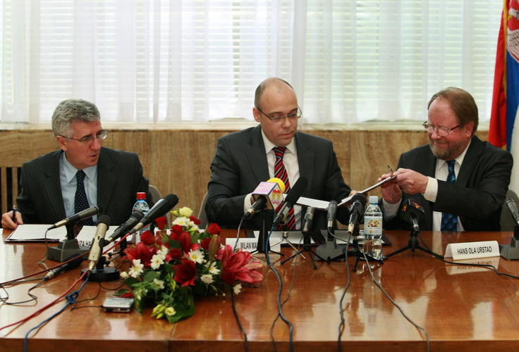 Milan Markovic (c), Minister for Public Administration, Riza Halimi (l), Member of the Serbia National Assembly, and OSCE's Hans Ola Urstad (r), sign agreement on co-ordination body for southern Serbia municipalities, Belgrade, 27 Mar 2009.