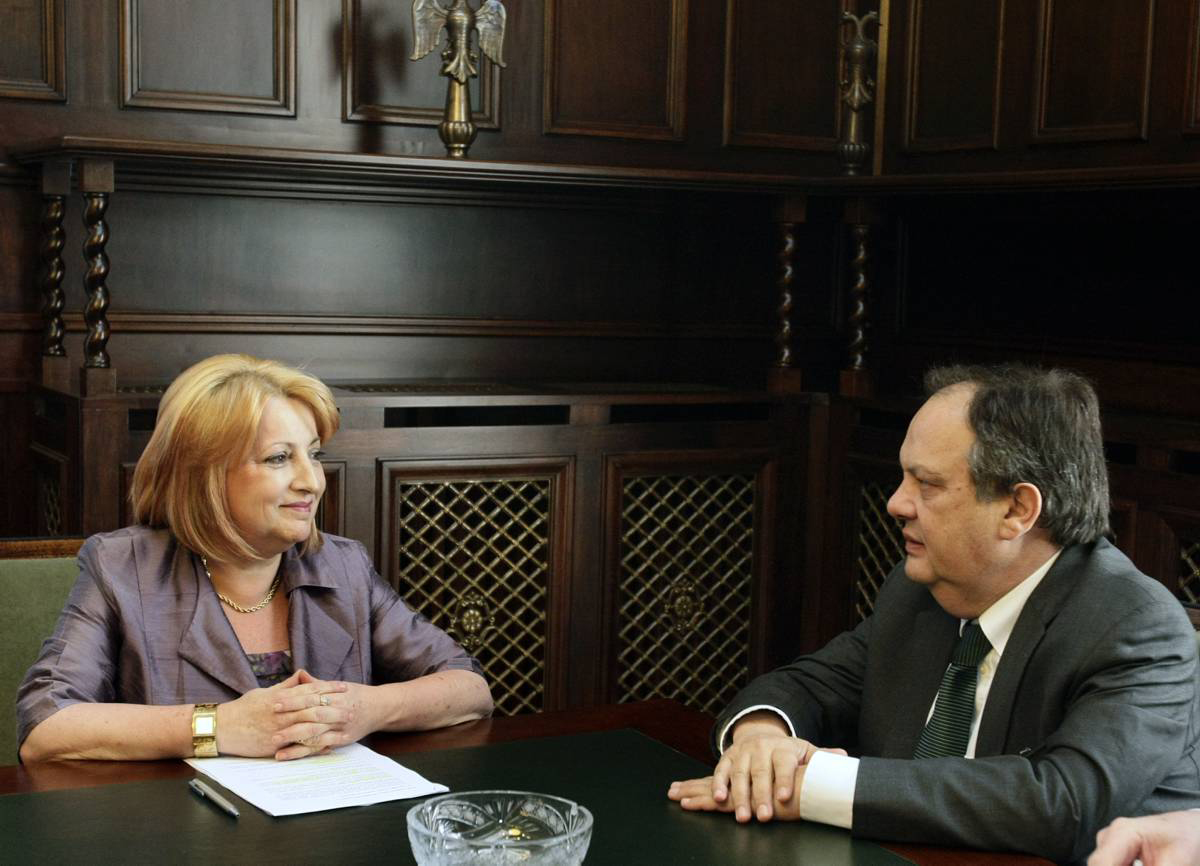The President of Serbia's Parliament, Slavica Djukic Dejanovic (left), speaks to OSCE Parliamentary Assembly President, Joao Soares during his visit to Belgrade, 11 May 2009.