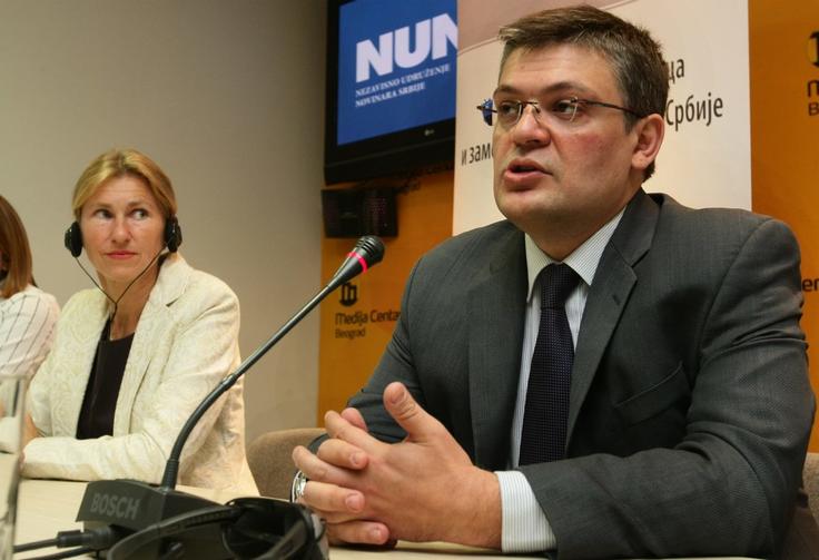 Slobodan Homen (r), State Secretary, Ministry of Justice, and Ruth Van Rhijn, Head of the ODIHR Rule of Law Department, during a presentation on the criteria for evaluation of the work of prosecutors, Belgrade, 3 July 2009.