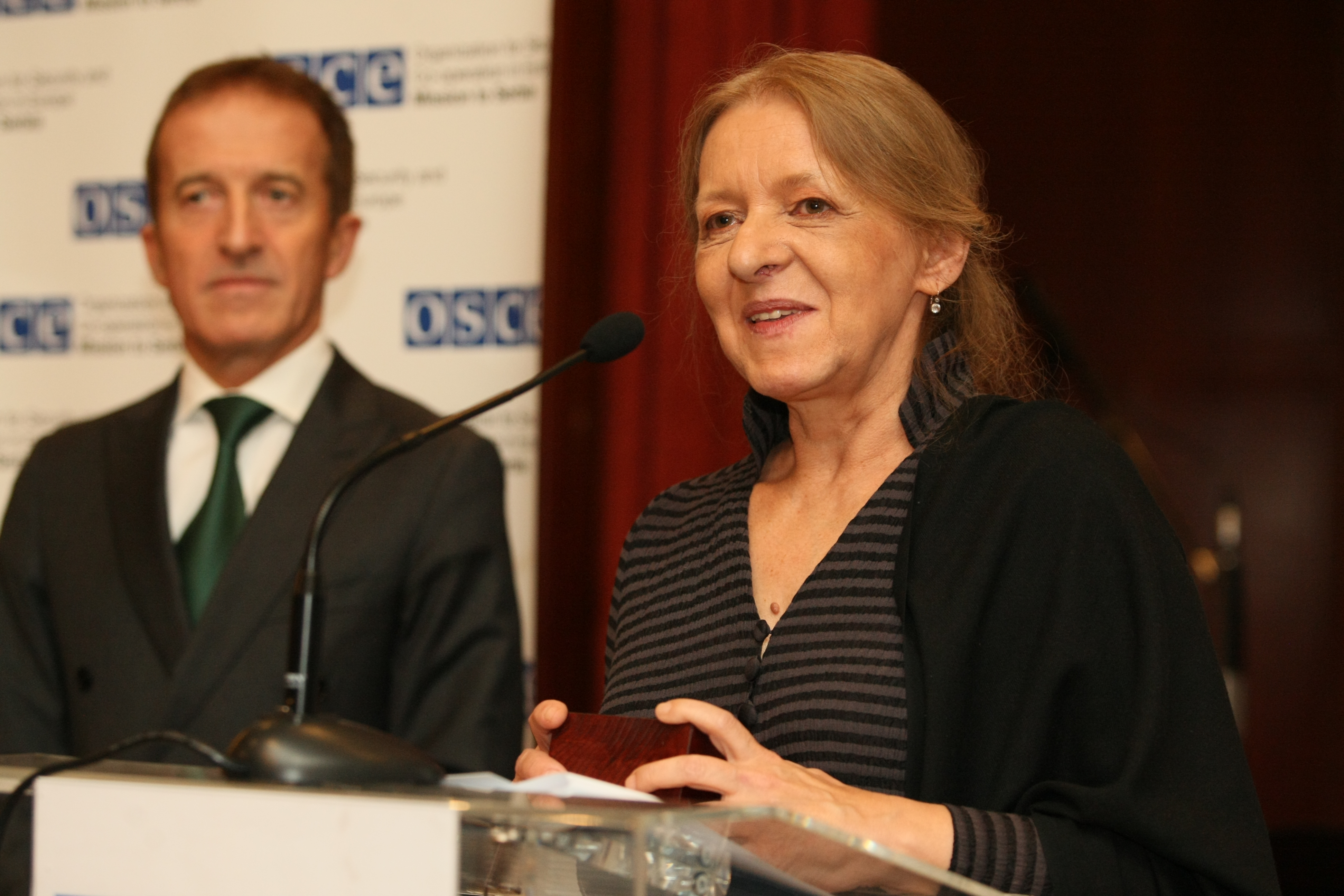 Journalist Zsuzsanna Szerencsés (r) who was awarded the Mission's 2013 Person of the Year Award for her promotion of freedom of expression and democratic dialogue, alongside the Head of the OSCE Mission to Serbia Ambassador Peter Burkhard, Belgrade, 11 December 2013.