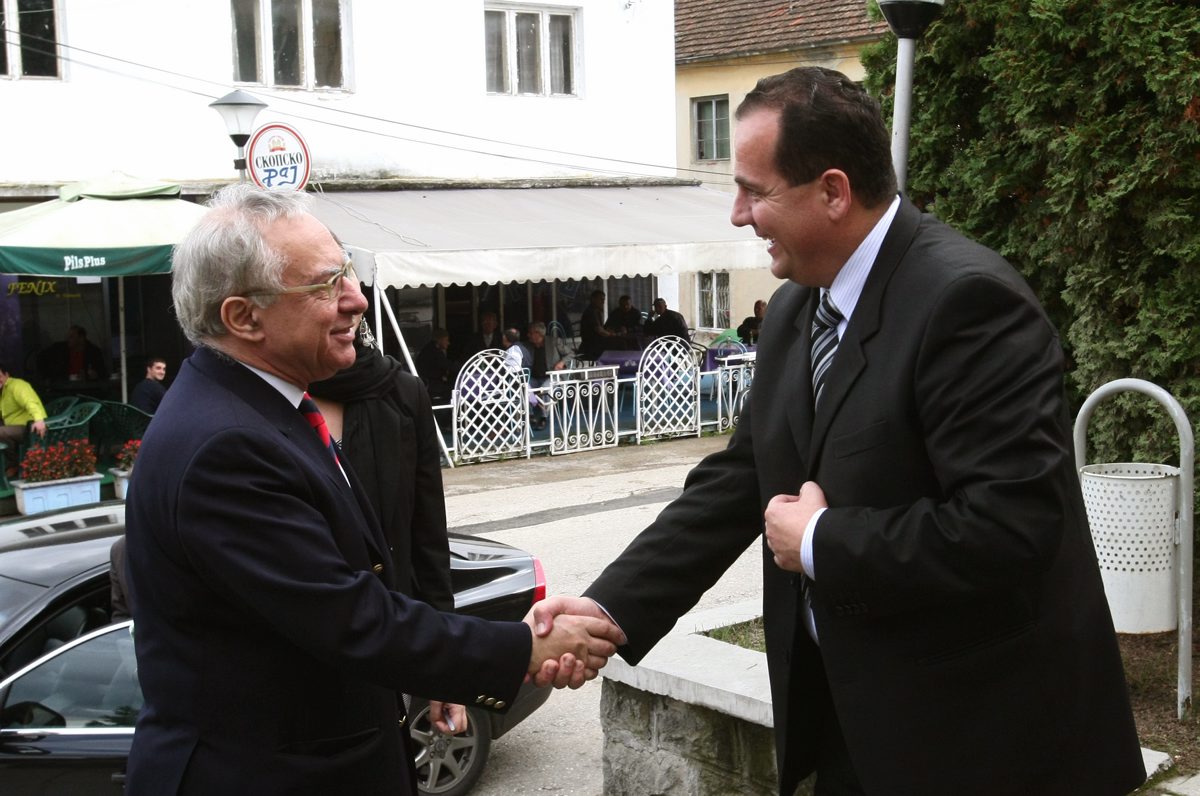 Slobodan Draskovic (l), Mayor of Medvedja, welcomes Head of the OSCE Mission to Serbia Ambassador Kypreos (r) to the opening ceremony of the bilingual faculties of law and economics in Medvedja, 12 October 2009.
