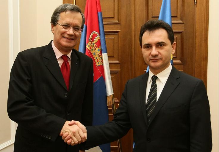 OSCE Secretary General Marc Perrin de Brichambaut (l), shakes hands with Serbian Deputy Prime Minister for EU Integration Bozidar Djelic, Belgrade, 15 December 2009.
