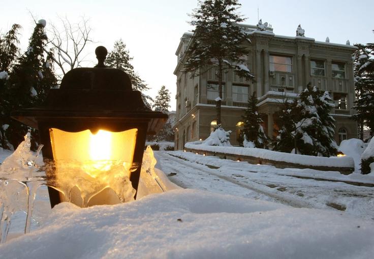 A lamp glows in the snow outside the offices of the OSCE Mission to Serbia in Belgrade, 21 December 2009.