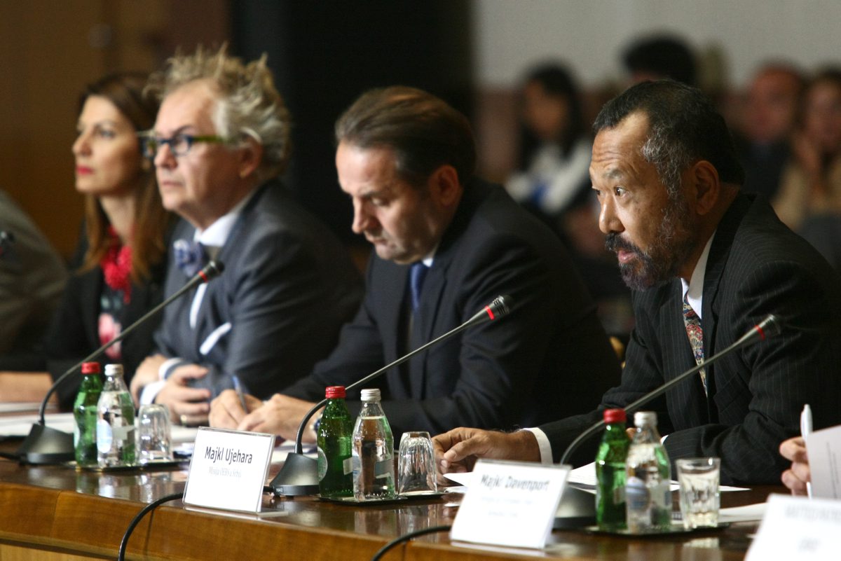 (r-l) Michael Uyehara, Acting Head of the OSCE Mission to Serbia, Rasim Ljajic, Deputy Prime Minister and Minister of Trade, Tourism and Telecommunications of the Republic of Serbia and Ivan Tasovac, Minister of Culture and Information of the Republic of Serbia make opening remarks during roundtable consultations on the transition from analogue to digital television broadcasting, Belgrade, 9 September 2014.