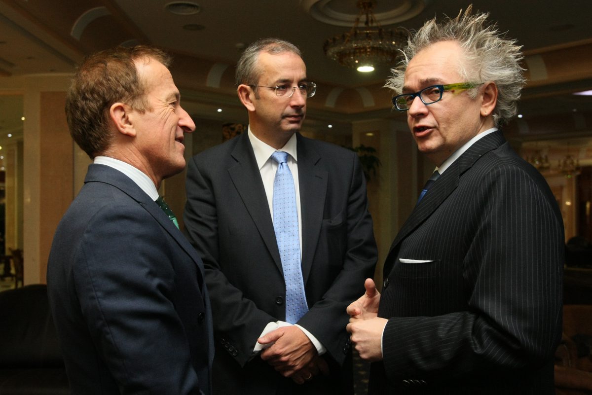 Ambassador Peter Burkhard, the Head of the OSCE Mission to Serbia; Ambassador Michael Davenport, the Head of EU Delegation to Serbia; and Ivan Tasovac, Serbia's Minister of Culture and Information, discuss the implementation of new media legislation, Arandjelovac, 28 November 2014.