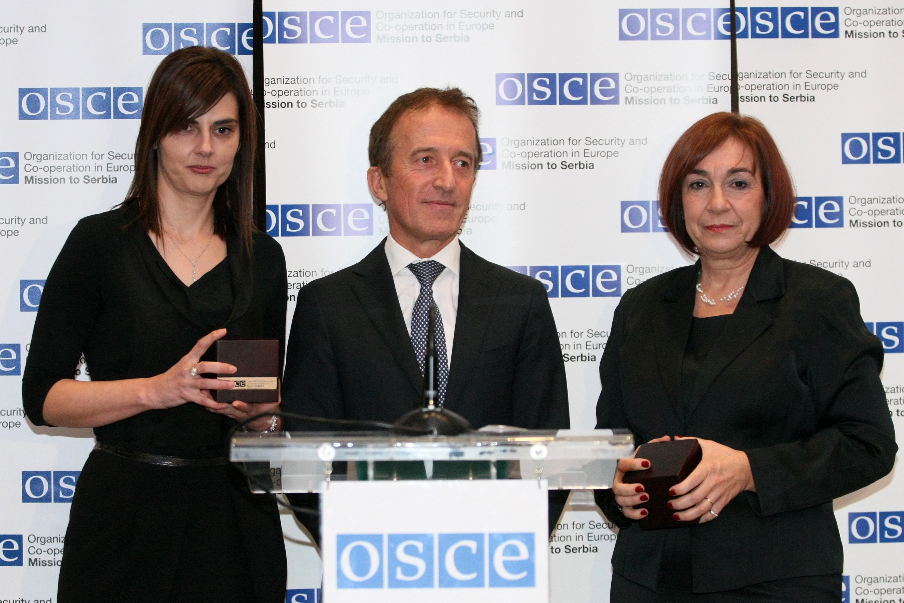 Aleksandra Stepanović, the Head of Department for Protection of Human Rights of Persons Deprived of Liberty within the Prison Administration in the Ministry of Justice (l) and Judge Vida Petrović Škero (r) - winners of the 2014 OSCE Mission to Serbia Person of the Year Award, along with Ambassador Peter Burkahrd, the Head of the OSCE Mission to Serbia, after an award ceremony, Belgrade, 9 December 2014.