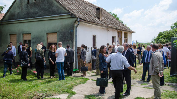 Vistors awaiting a press conference in front of the Škorić family house, which will be improved with building material provided by the OSCE-supported Regional Housing Programme, Nikinci, 27 June 2015.