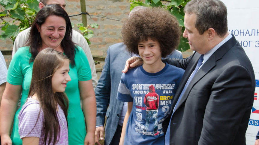 OSCE Chairperson, First Deputy Prime Minister of Serbia, Ivica Dačić with Škorić family members - the first among the refugee families that received building material as a part of the Regional Housing Programme, Nikinci, 27 June 2015.