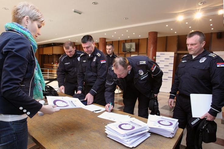 Following a presentation of the “Manual on Safety Councils in Cities and Municipalities”, police officers collect copies for local self-government and regional police representatives, Novi Sad, 15 March 2016.