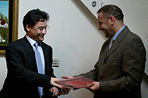 Head of Mission Maurizio Massari and Serbia and Montenegro's Minister for Human and Minority Rights, Rasim Ljajic, at the signing of an agreement on training national minority councils, 16 April 2003.