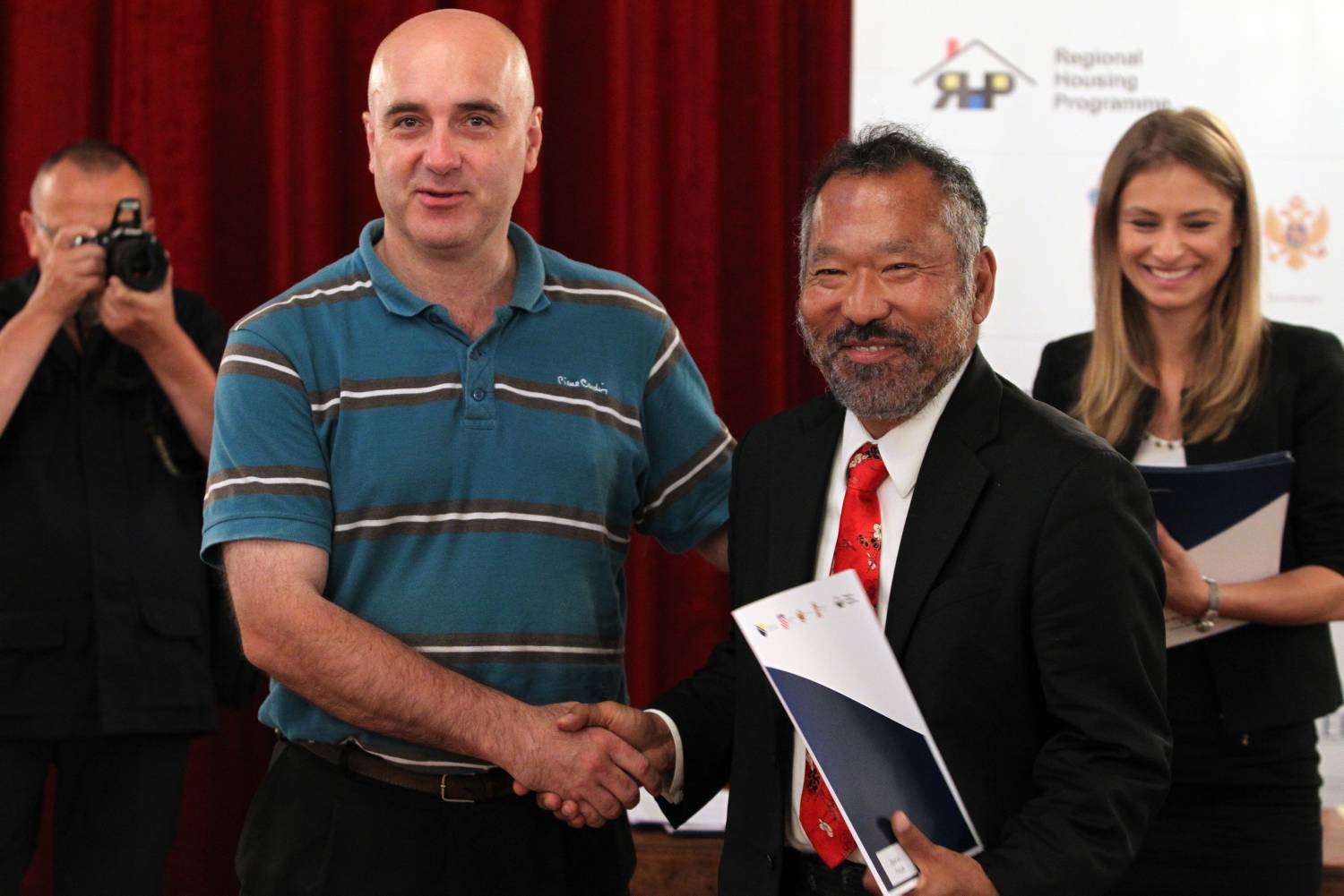 Deputy Head of the OSCE Mission to Serbia, Michel Uyehara (r), hands out the donation agreement to one of the beneficiaries of the Regional Housing Programme (RHP) at the Ceremony of handing out the donation agreement for purchase of village houses under sub-project 3 of RHP, Belgrade, 27 June 2016.