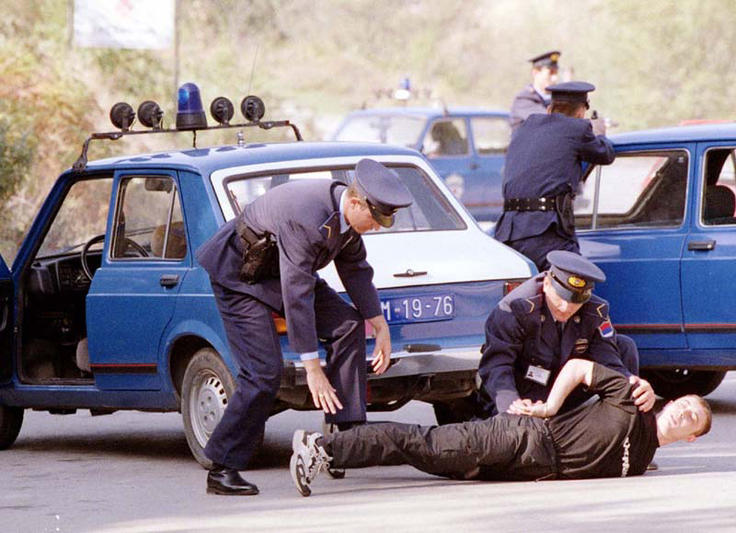 Newly trained police officers demonstrate their skills at the graduation ceremony in Mitrovo Polje, southern Serbia, 17 October 2001.