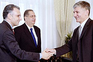 The late Serbian Prime Minister Zoran Djindjic had supported his country's close co-operation with the OSCE. He met Jaime Gama, the then Chairman-in-Office (centre), and Stefano Sannino (left), then OSCE Mission Head, in Belgrade on 19 February 2002.