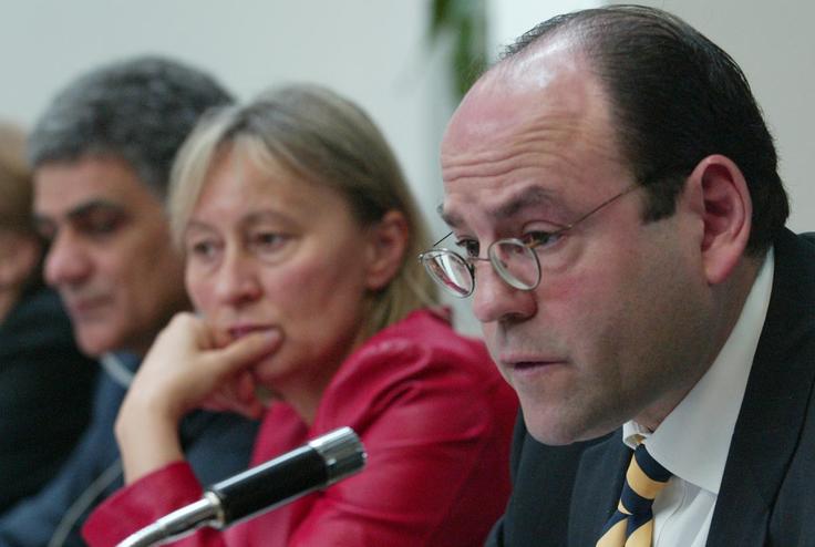 Deputy Head of the OSCE Mission to Serbia and Montenegro, Mark Davison (r.), Serbian Deputy Justice Minister, Gordana Pualic (ctr) and Dusan Zlokas from the country's Interior Ministry at an anti-human trafficking roundtable in Serbia, 3 June 2004.