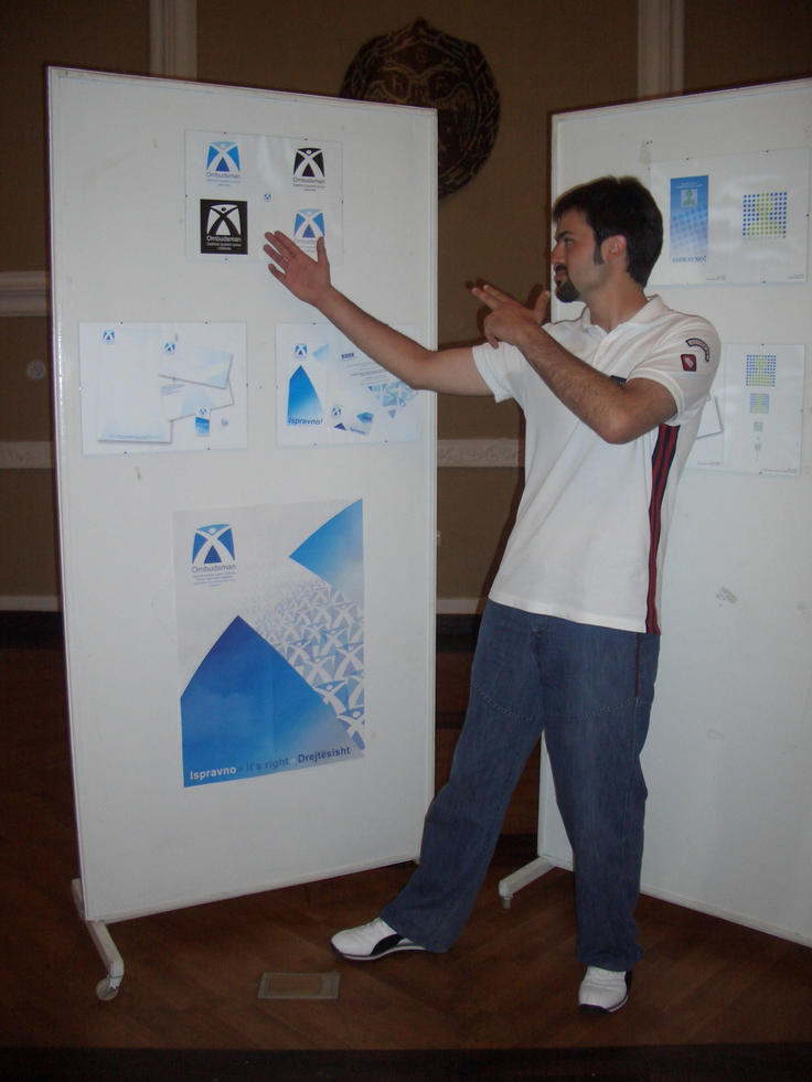 Marko Radunovic shows off his winning logo which will help raise awareness of Montenegro's young Ombudsman institution, July 2005.