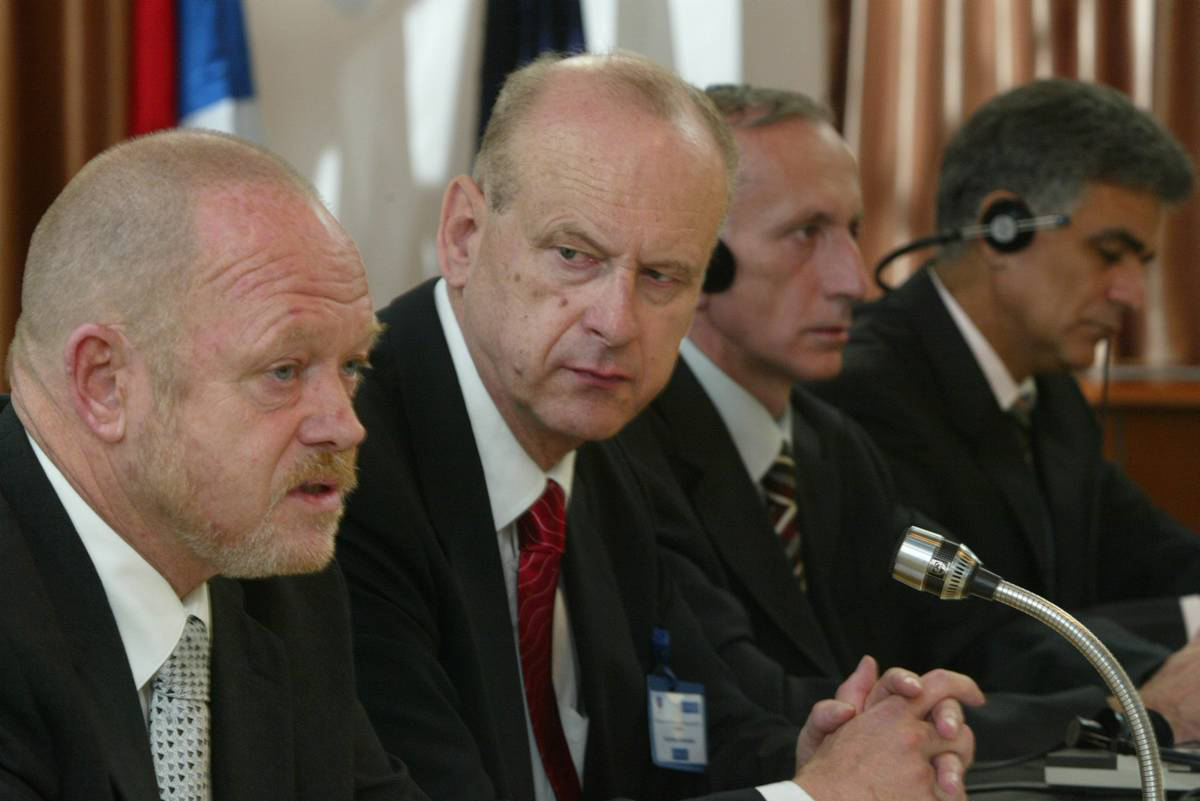 The Head of the OSCE Mission to Serbia and Montenegro's Law Enforcement Department, Nils Bechmann (left), addresses the workshop on regional cross-border co-operation, Belgrade, 29 September 2005.