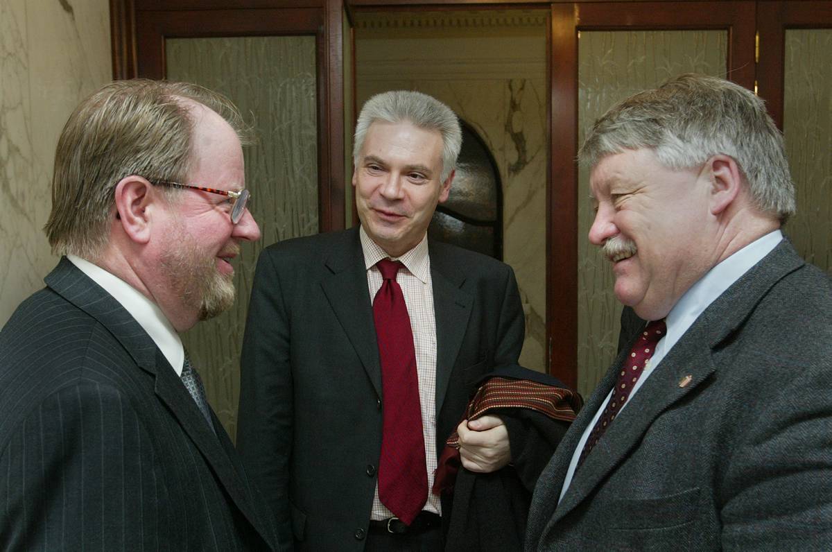 Head of the OSCE Mission to Serbia and Montenegro Hans Ola Urstad (left), Austrian Ambassador Gerhard Jandl (centre) and Wolfgang Grosruck of the OSCE Parliamentary Assembly meet before a special briefing on the Mission's activities, 8 February 2006.