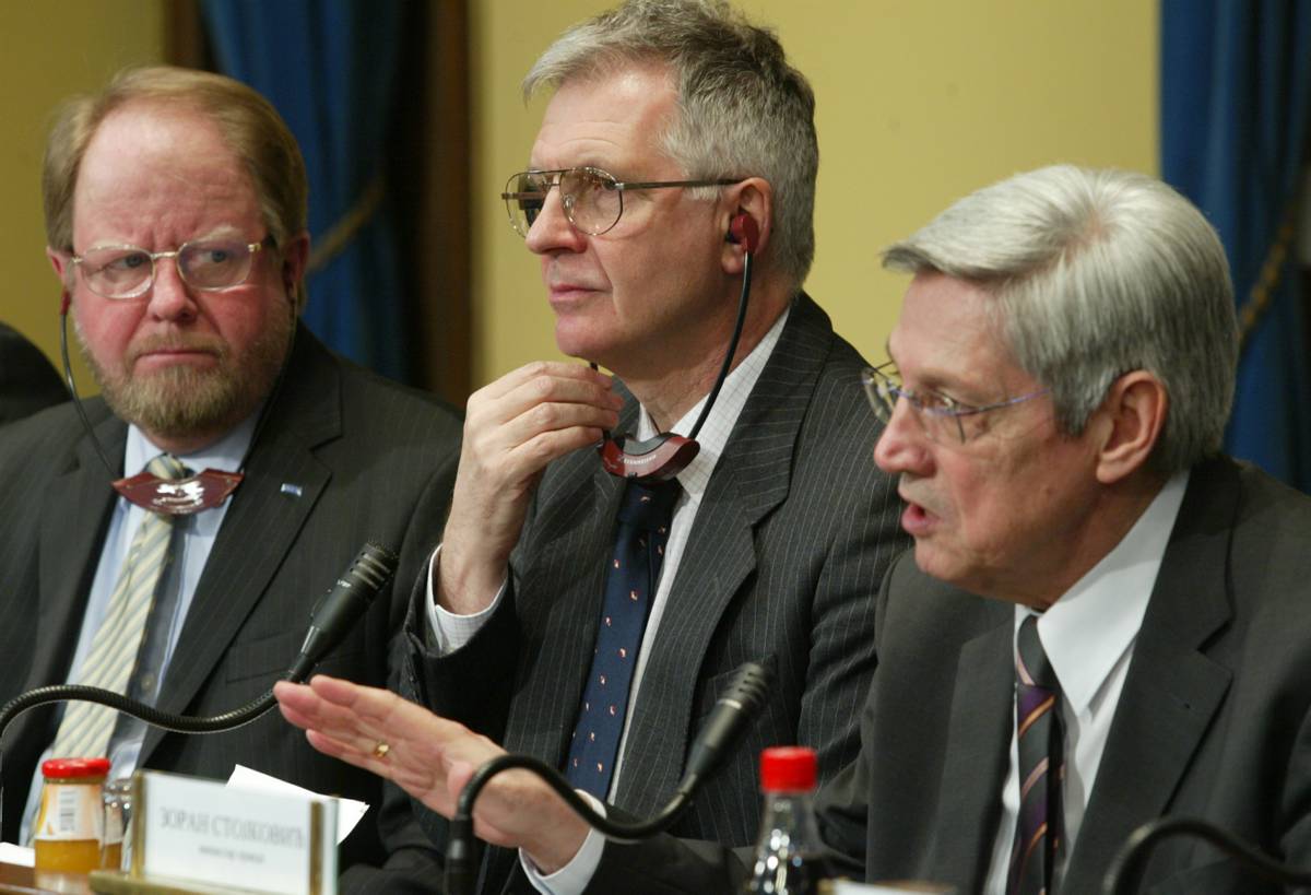 Head of Mission Hans Ola Ursatad (left), UK Ambassador to Serbia and Montenegro David Gowan (centre) and Serbian Minister of Justice Zoran Stojkovic presenting new law enforcement publication to the press, Belgrade, 17 March 2006.