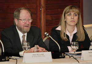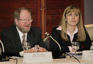 Amb. Hans Ola Urstad, Head of the OSCE Mission to Serbia, and Snezana Samardzic-Markovic, Serbia's Minister of Youth and Sports, during a conference on finalizing the draft of the National Youth Strategy, Belgrade, 7 March 2008.