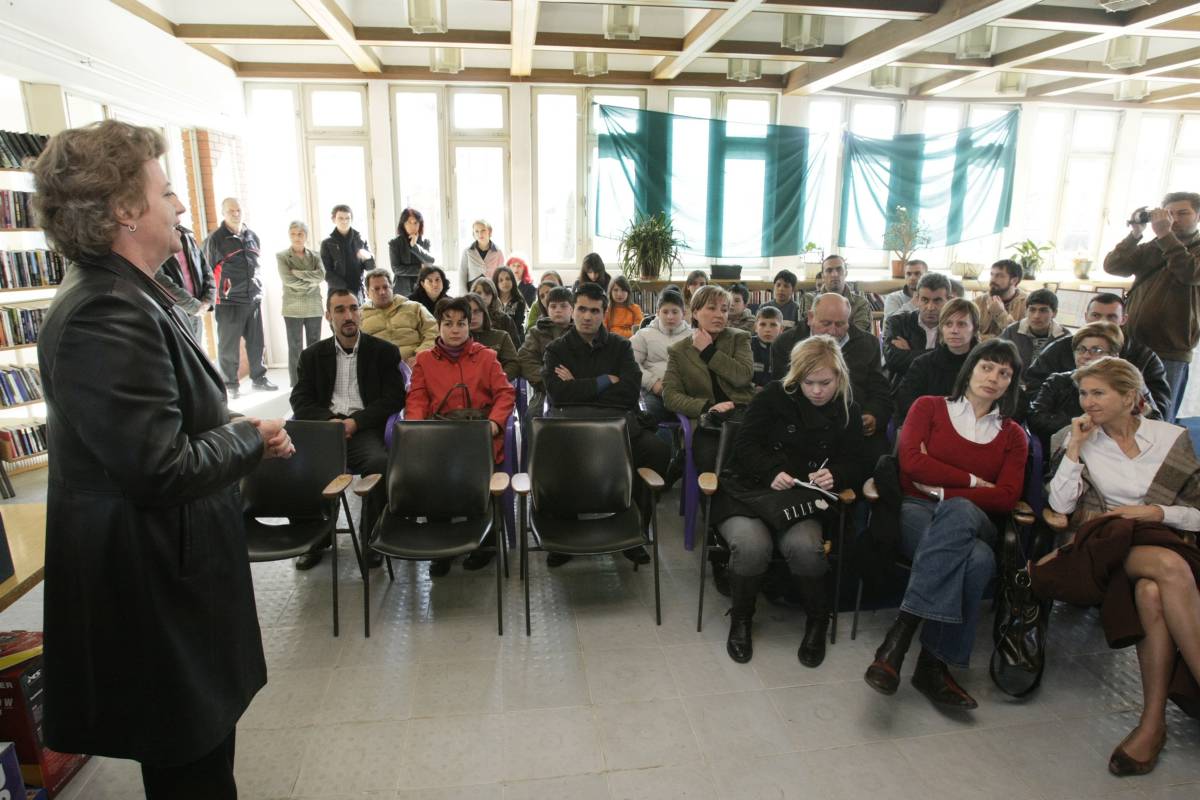 Biljana Nikolic, Director of the Centre for Democratic Activities, addresses the awards ceremony for a Mission to Serbia-supported anti-corruption art competition, Lebane, 26 March 2008.