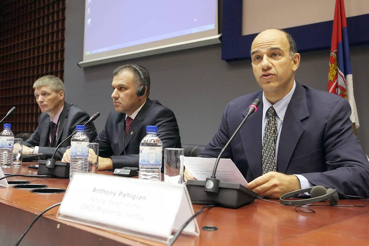 Deputy Head of OSCE Mission to Serbia Anthony Pahigian (right) and State Secretary of the Ministry of Interior Dragan Markovic at an international forum on police education, Belgrade, 29 September 2008.