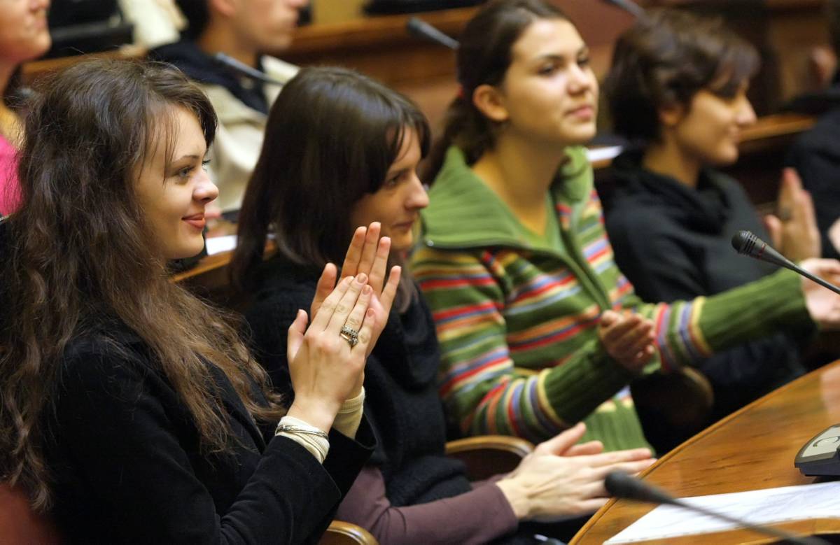 Students from high schools across Serbia take part in a simulation of a parliamentary session at the Serbian National Assembly in Belgrade, 22 November 2008.