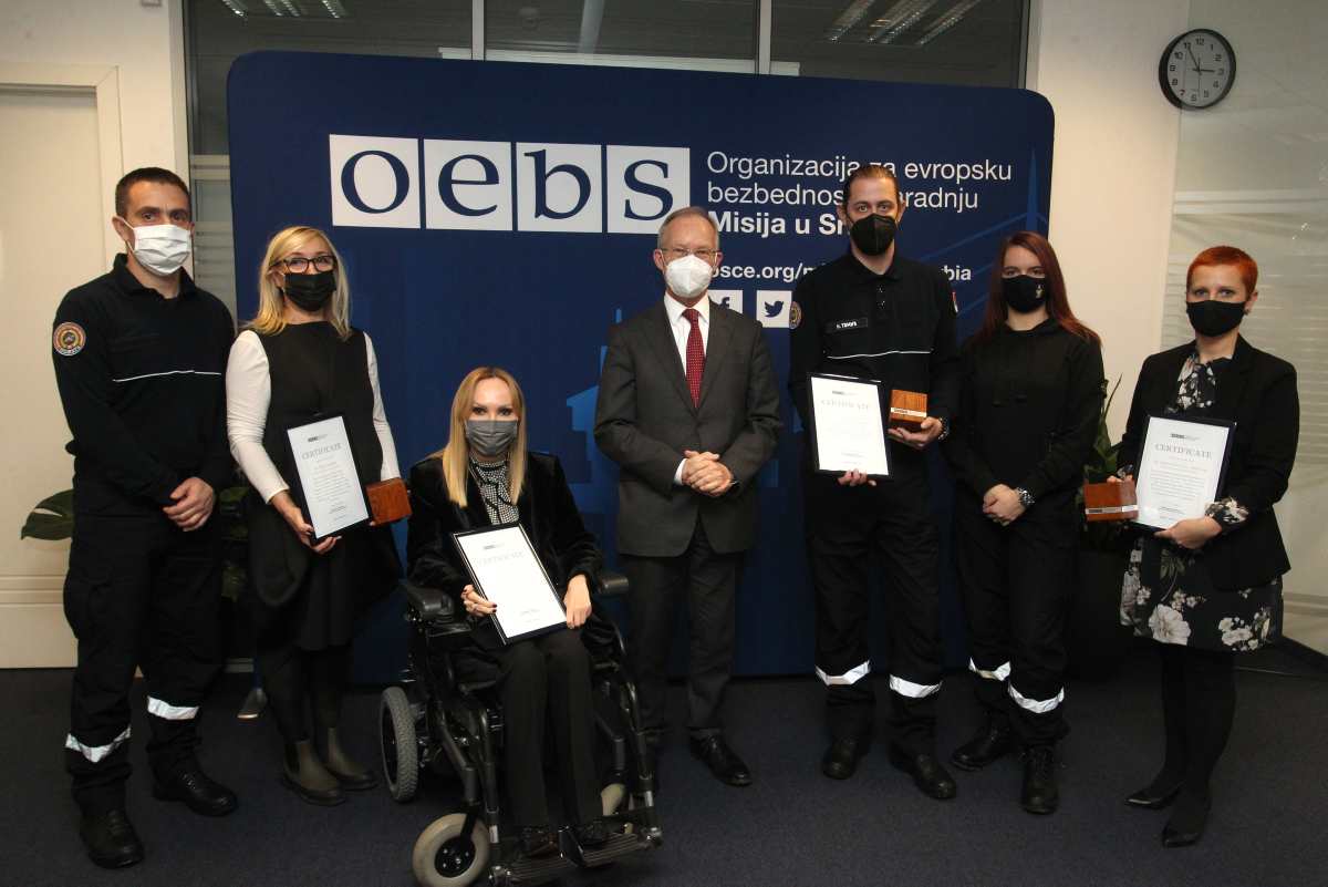 Jan Bratu (c), šef Misije OEBS-a u Srbije, dočekao je dobitnike/ce Godišnje nagrade za 2021. godinu: Vladimiru Dorčovu-Valtnerovu (d), osnivačicu i glavnu urednicu portala Storyteller, iz Maglića i Dobrovoljno vatrogasno društvo iz Požege (c-d), kao i dobitnice nagrade za 2020. godinu: Ivanku Jovanović, izvršnu direktorku Nacionalne organizacije osoba sa invaliditetom Srbije (NOOIS), i Biljanu Stepanov, direktorku Centra za podršku ženama iz Kikinde.