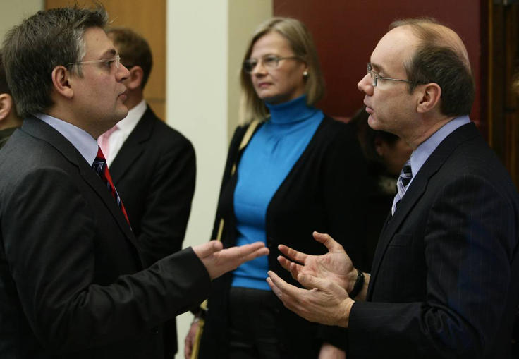 Slobodan Homen, State Secretary, Serbian Justice Ministry (l), and Thomas Moore, Deputy Head of the OSCE Mission to Serbia